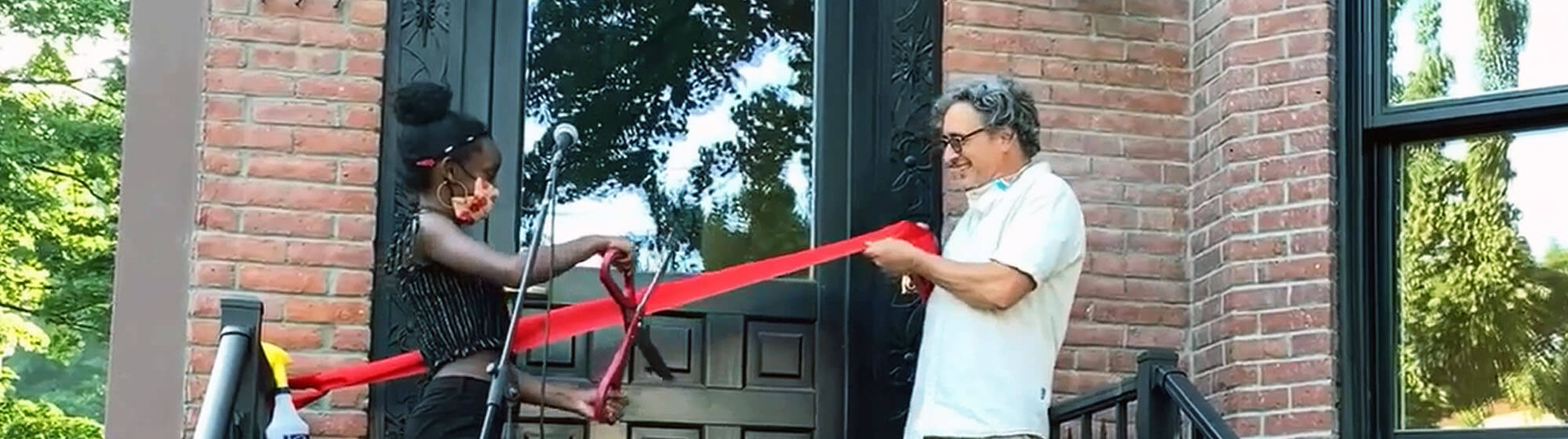 Michael Robinson, Builder and Developer speaks about his experience with North Miller Passive Multifamily and cuts the ribbon with his daughter, Taya.