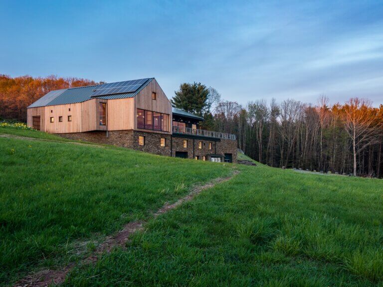 “My childhood was spent exploring Hudson Valley’s barns – many that don’t exist today. This experience inspired the wood-slatted entryway and its enticing play of shadows during the day, which transforms into a lantern at night.”
